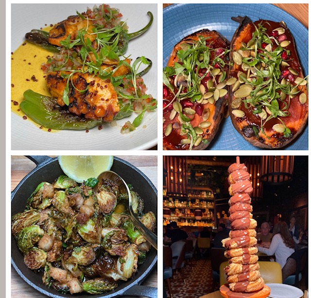 We started with a delicious tropical vodka-based drink with lychee flavours. This was a perfect way to start with our guacamole platter, made with Hass avocado, lime, cilantro, chili, and served with plantain chips, homemade tortilla chips, and assorted homemade arepas. I could have just made my dinner from this. There is a half dozen different ceviches on the menu. Our server Frank recommended the tropical Corvina ceviche, with passion fruit, Lecce de Tigre, mango, dragon fruit, mint, red onion, and cilantro. The presentation was lovely and in theory, it sounded wonderful, but in reality, it was fishy and bland. I couldn’t taste any discernible flavours. Ditto for the bay scallop ceviche, in a clementine citrus broth, with celery, chilies, hearts of palm and cilantro. This was a touch better, but not up to my standards. I love a good ceviche. On to the hot section, the Adado negro arepas with braised short rib and fresh pico had a good mix of sweet and spicy but would have been better if served hotter. The grilled Peruvian octopus with crispy quinoa and an aji Amarillo sauce was nice, as was the roasted poblano tamale with braised chicken, and cotija cheese in a molé sauce. Our server pushed the rotisserie chicken over the pumpkin seed crusted lamb chops with zucchini blossoms, saying that rotisserie chicken is more difficult to find? Really? Personally I’ve never had a lamb chop prepared like the one I mentioned but I often have rotisserie chicken. So we went with his suggestion. The chicken was moist but the skin was wet and soft, not crisp. It was in a chimichurri and Meyer lemon sauce, which added a nice flavour. It was served with creamy sauced potato. I would have preferred crispy fried potatoes like I experienced in Peru. Our sides were delicious, sweet/spicy Brussel sprouts topped with pork belly, and sweet potato with pomegranates and pepitas.