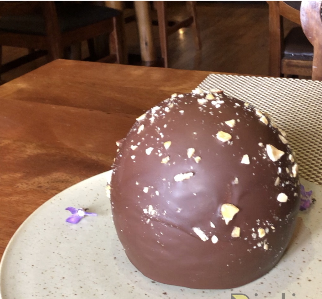 The showstopper is a chocolate dessert, where they poured a hot caramel and chocolate sauce on top of a chocolate ball, and it melts the ball to reveal some ice cream and fruits inside.