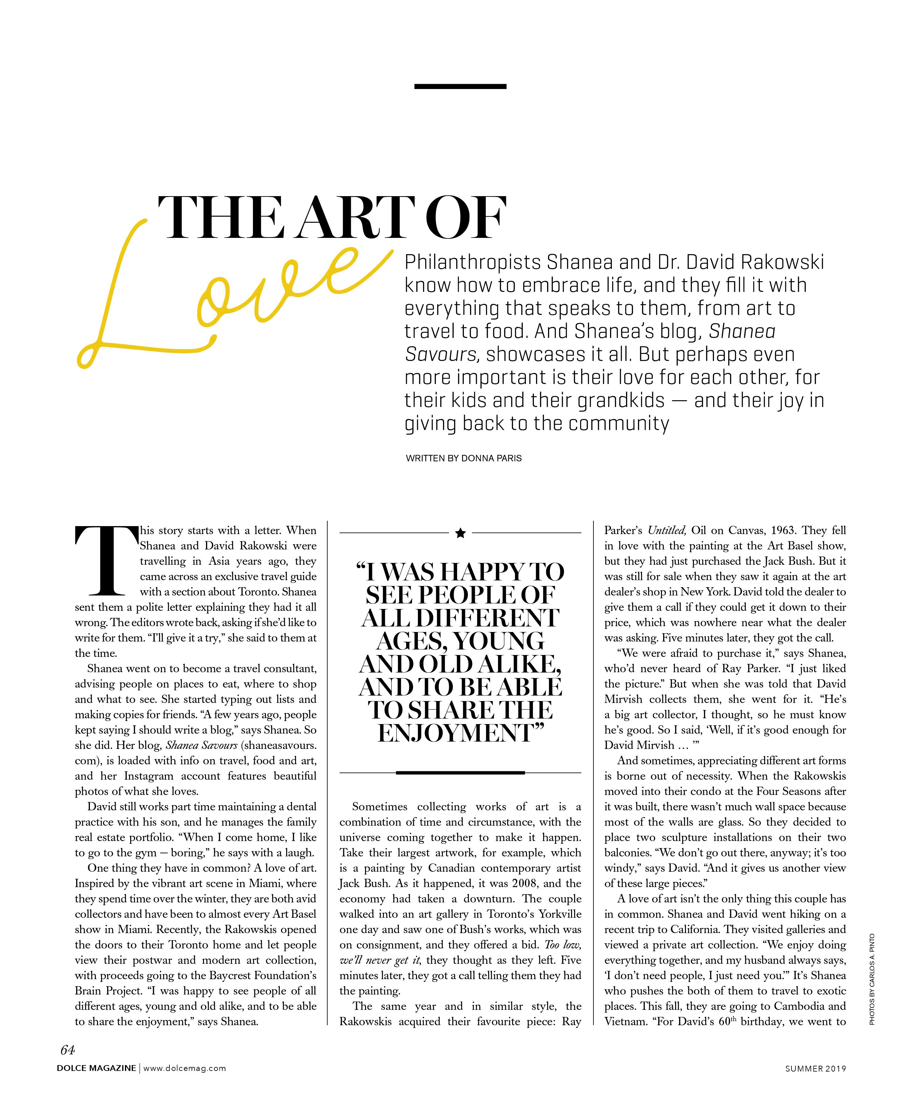 Philanthropists Shanea and Dr. David Rakowski know how to embrace life, and they fill it with everything that speaks to them, from art to travel to food. And Shanea’s blog, Shanea Savours, showcases it all. But perhaps even more important is their love for each other, for their kids and their grandkids — and their joy in giving back to the community.